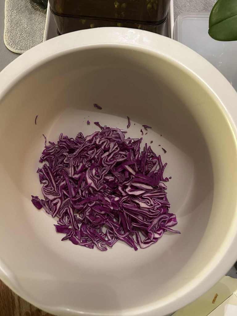 Start by slicing the red cabbage as thin as possible — really thin… ideally paper-thin. However, if you slice it thicker, it will simply need a bit more time to soften later. A food processor also works well if you’re making a large batch, though hand-sliced cabbage gives the most luxurious texture.