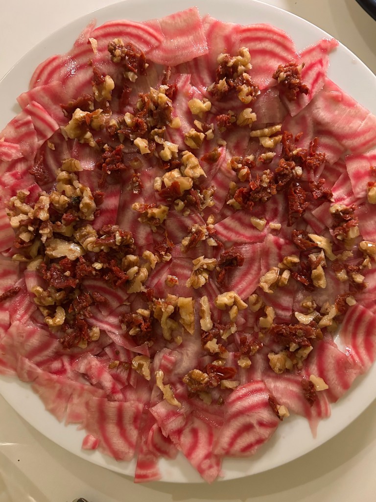 Peel the Chioggia beet(s) and slice them ultra-thin. The key to this recipe is slicing the beet paper-thin across the stripes — this is what makes both the texture and the visual effect work. I personally use a vegetable peeler.