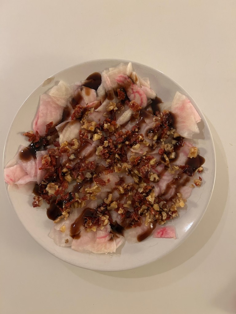 1 large Chioggia beet or 2 small ones, 1 dl walnuts, 2–4 sun-dried tomatoes in oil, 1 lemon, 1 tsp flake salt, Thick balsamic vinegar (balsamic glaze)